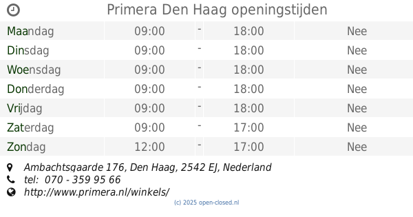 Het is ook mogelijk: Bewerk deze OPENINGSTIJDEN van Winkel Primera In Den Haag, Ambachtsgaarde 176,